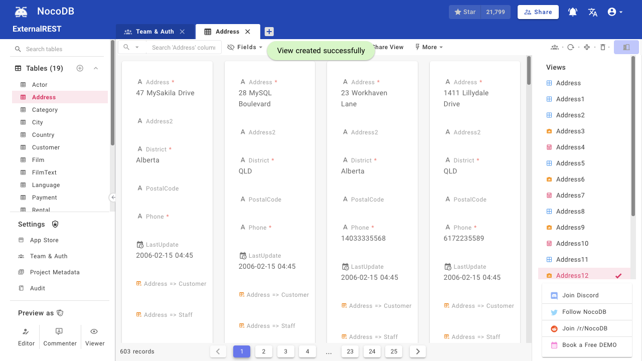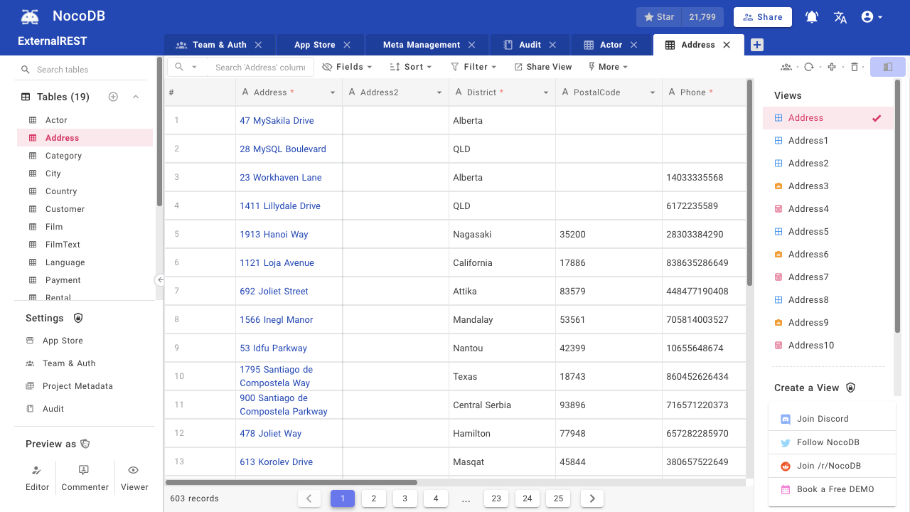 NocoDB is an open-source platform that transforms your database into a smart, spreadsheet-like interface. It enables developers to manage both data and schema visually—without writing any SQL.