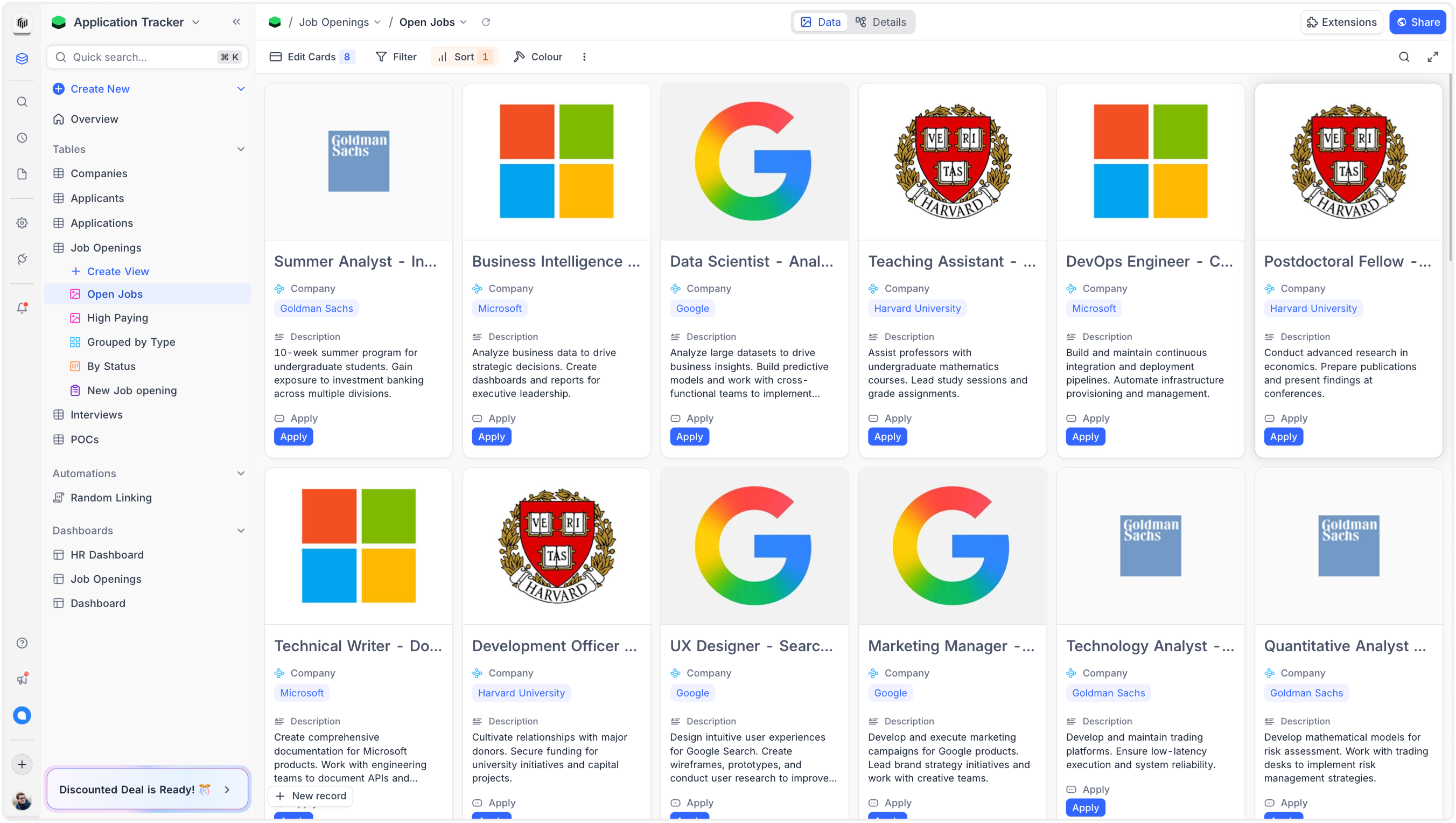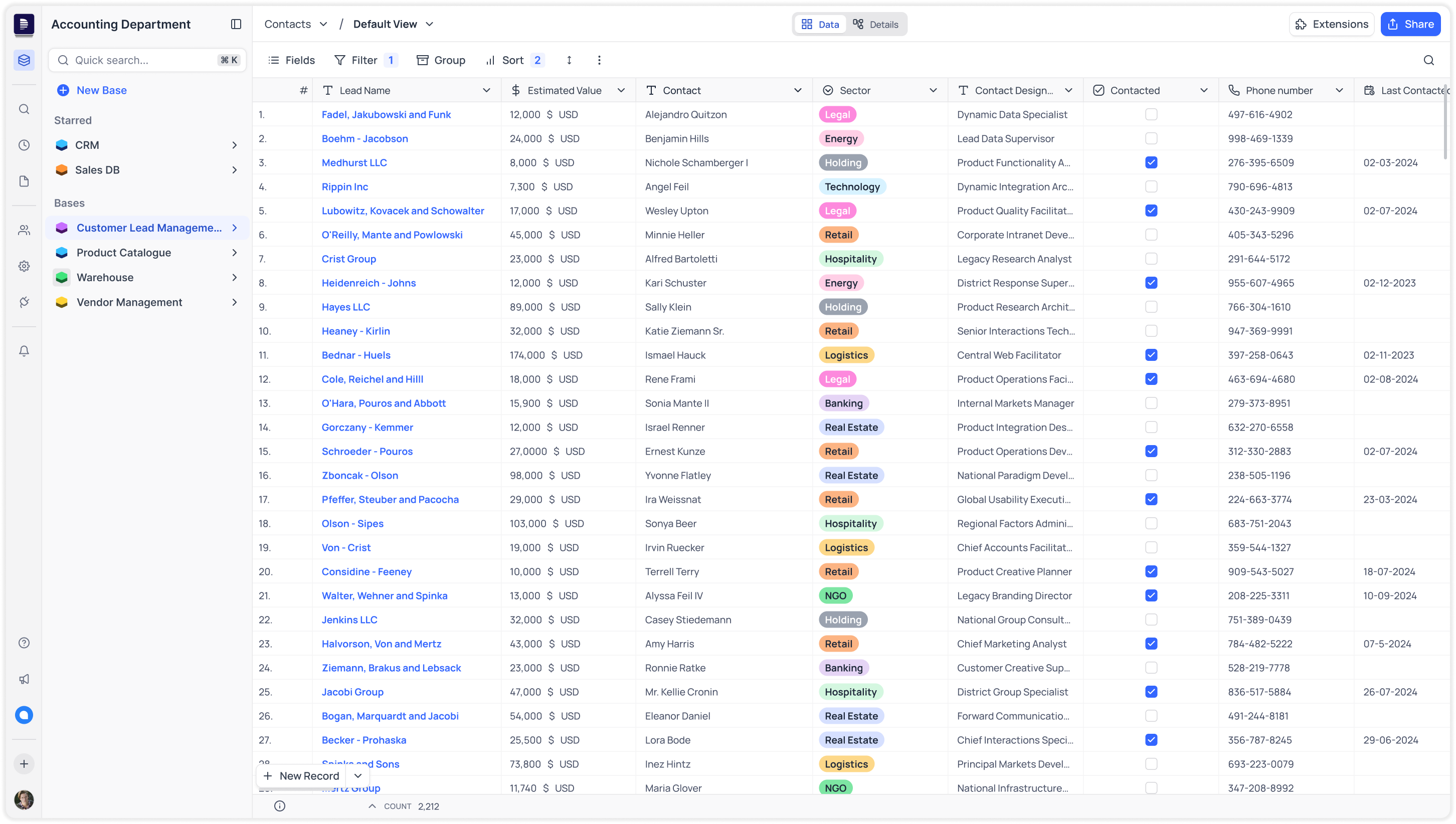 Offering deep control over users data with powerful filters, filter groups, flexible sorting options, field visibility, record grouping and row colouring options.